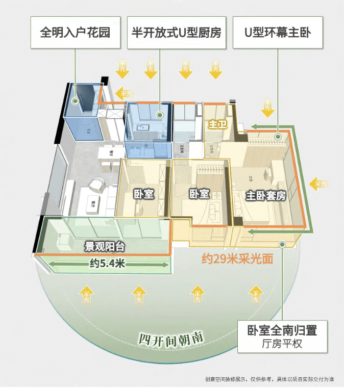 约5.4米景观阳台+U型环幕主卧+全卧室南向归置等,尽可能打开的尺度,向南一推窗即超500米无遮挡、约17万方的晓港公园。