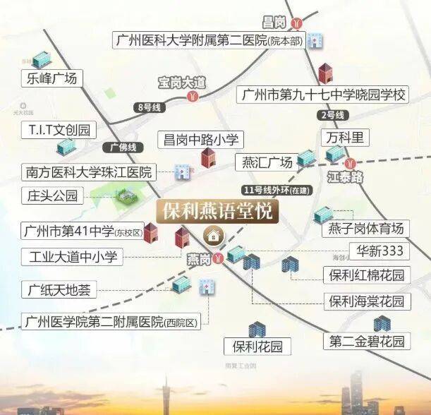 项目紧邻燕岗站,随着广州11号线的开通,这里升级为双地铁站点,极大地提高了通勤的便捷性。无论是前往天河、琶洲还是金融城等CBD区域,都能实现一线直达。同时,真·地铁上盖的设计让业主们能够更加从容地掌控出行时间。