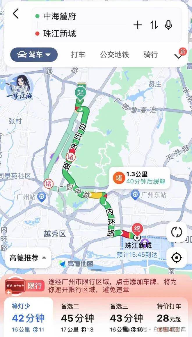 自驾珠江新城:小区出来走白云大道南转内环路即可到达珠江新城,全程16公里耗时42分钟,打车28块,地铁10站耗时50分钟。