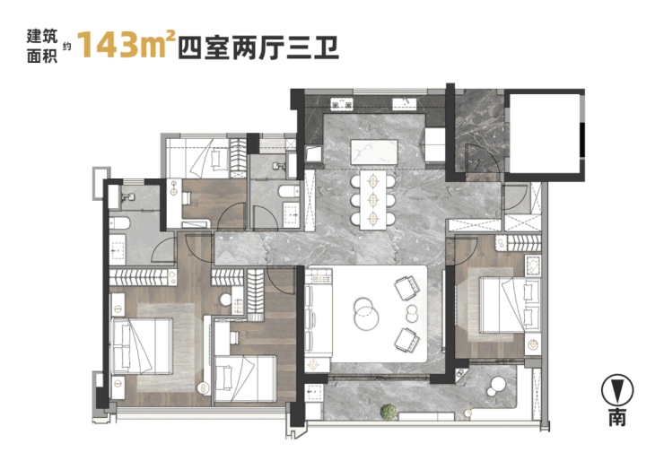 建面143平四房,该户型有点像中海观云府164平的户型,四开间朝南+LDKG一体化设计,和超大的观景阳台。