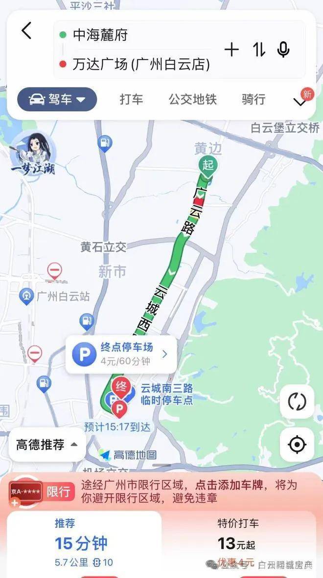 自驾白云新城:走广云路转云城西路即可到达白云新城,全程5.7公里耗时15分钟,打车13块,地铁5站耗时18分钟。