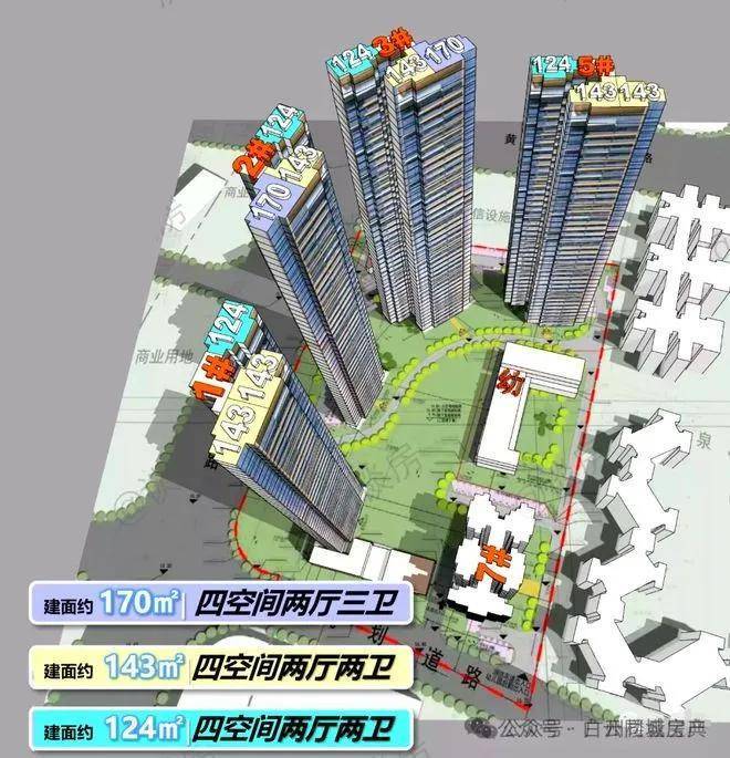 项目占地面积24992平方,共建了4栋住宅,两梯三户,1栋40层,2-3栋44层,5栋41层,目前主要在售户型:124、143、170平四房。