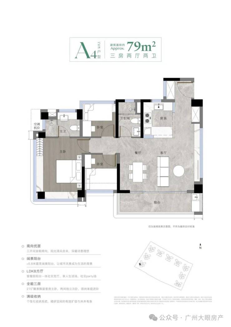 建面有约:79平三房两卫,94平三房两卫,108平双套间四房两卫,142平双套间四房三卫,项目使用率超100%,所有户型均为南向
