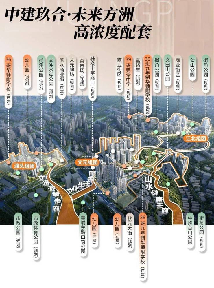 文元组团(未来方洲),配备一所12班幼儿园,36班九年一贯制学校
