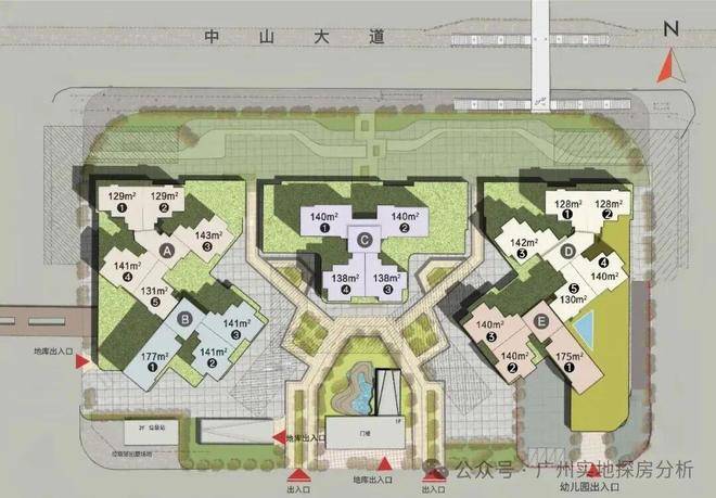 项目总共5栋楼,A栋和B栋、D栋和E栋是两栋并在一起的。由于紧挨着骏景花园,南向视野被遮挡,可能要25-26楼以上才能开阔点,北向的就受中山大道噪音影响,看着城中村。