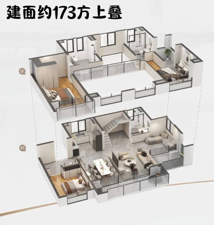 先看下产品剖面图,约167方下叠+约143~149方平层+约173方上叠:
