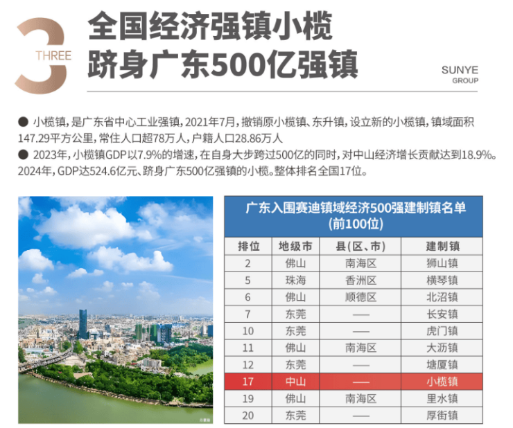小榄镇,是广东省中心工业强镇,2021年7月,撤销原小榄镇、东升镇,设立新的小榄镇,镇域面积147.29平方公里,常住人口超78万人,户籍人口28.86万人 2023年,小榄镇GDP以7.9%的增速,在自身大步跨过500亿的同时,对中山经济增长贡献达到18.9%2024年,GDP达524.6亿元、跻身广东500亿强镇的小榄。整体排名全国17位。
