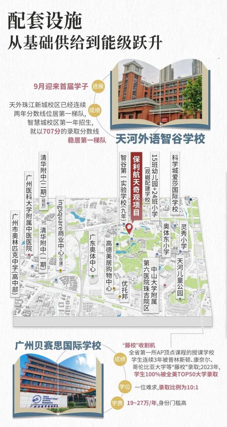 天外智谷分为两个校区,越秀观樾配建24班小学;缦云广州配建的九年制学校(18班小学+27班中学),今年9月份开学。