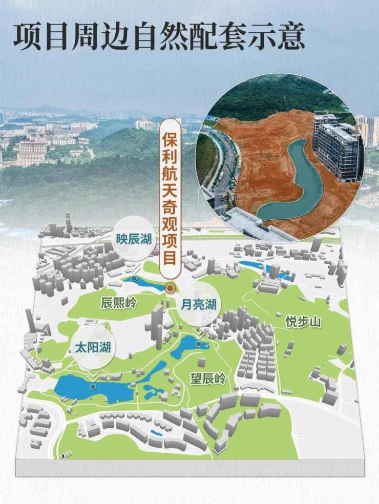 其东西跨度近300米,被保利航天奇观项目环抱其中,红线内所有建筑均围绕映辰湖打造。
