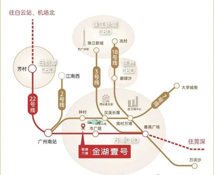 轨道交通:地铁 22 号线,市广路站距项目约 900 米,步行 10分钟可达,通过该线路可实现 “1 站番禺广场、2 站万博中心、3 站琶洲 CBD、4 站珠江新城” 的通勤效率;