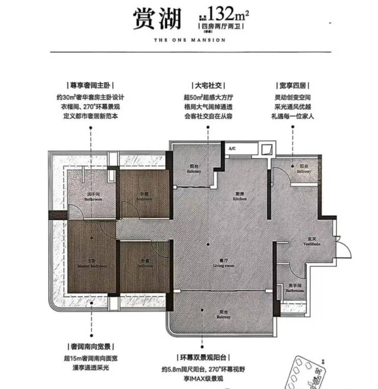 建面132平四房两卫,横厅南北对流设计,超50平的大方厅,约5.8米的景观阳台,主卧面积也有30平,带独立衣帽间。