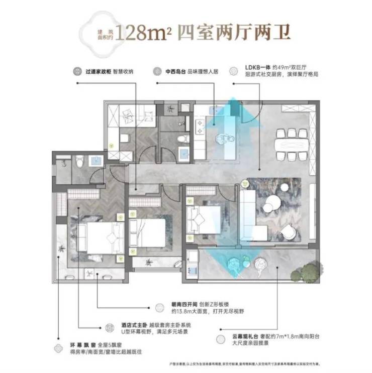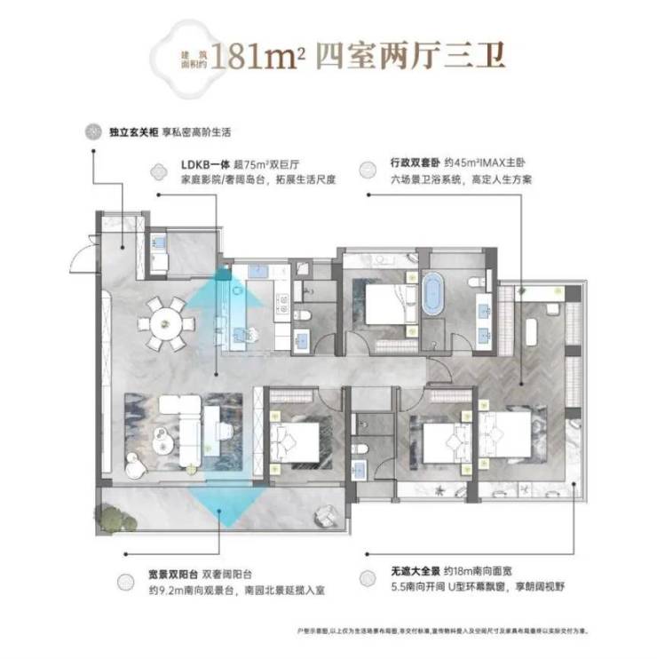 相比起128㎡,181㎡四房的空间配比就显得豪横很多,做到景观、流光、价值最大化,重新定义了东莞180平户型标准。