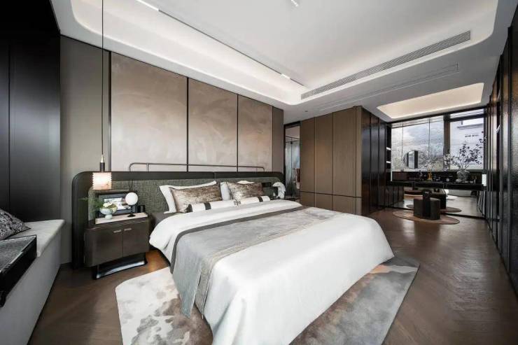 Ø U型全面屏主卧:行政主卧面积达40㎡,比普通户型的客厅还大,做到主卫、休息区、衣帽区三条动线互不干扰,约15米的U型全面屏飘窗,一直延伸至衣帽区。
