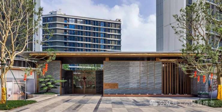 大家都说大门是一个项目的门面,而大学星汇城的大门景墙铺了石材,金属包边勾勒,背景墙做了金属格栅,保持了园林私密性,特别的是,其实原本设计方案计划是放置冬青树,但最后交付了豪宅标配价值六位数的罗汉松,据说这是越秀特地给业主升级。