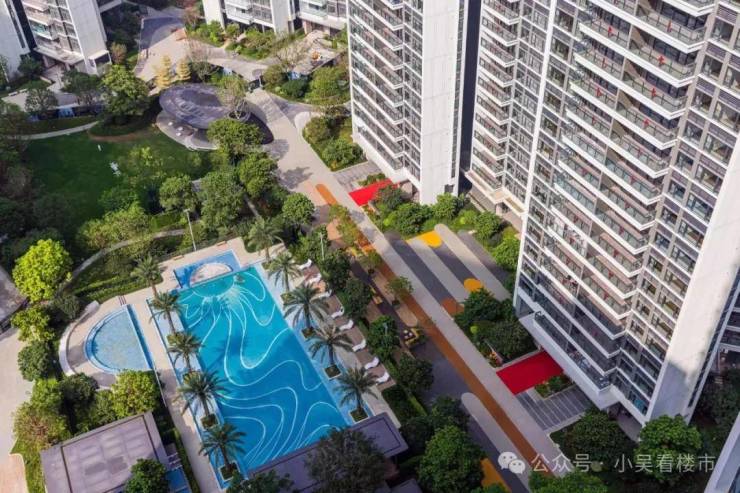 小区泳池两边种了高大的银海枣,颇有海岸度假风情,做了一个超大泳池和儿童池,展现园林优势。
