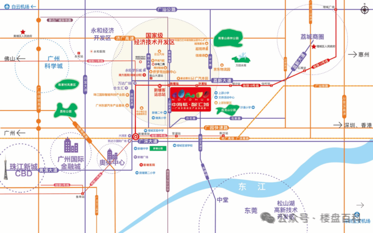 自驾——紧挨广园快速、开创大道、荔新大道等主干线,回广州市区和东行东莞等城市都方便;