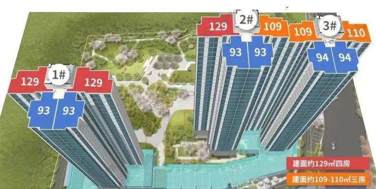 户型上,小区的户型设计基本一样,产品涵盖建面约93-95平、110平、129平四种户型,