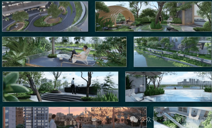 利用裙房,将项目整体抬升近20米,使住宅景观无遮挡,北望珠城/琶洲CBD、广州塔璀璨繁华,南瞰超万亩湿地自然生态风光然河涌,并沿途打造了开放式街角公园,与社区园林无边界衔接,景观优美。