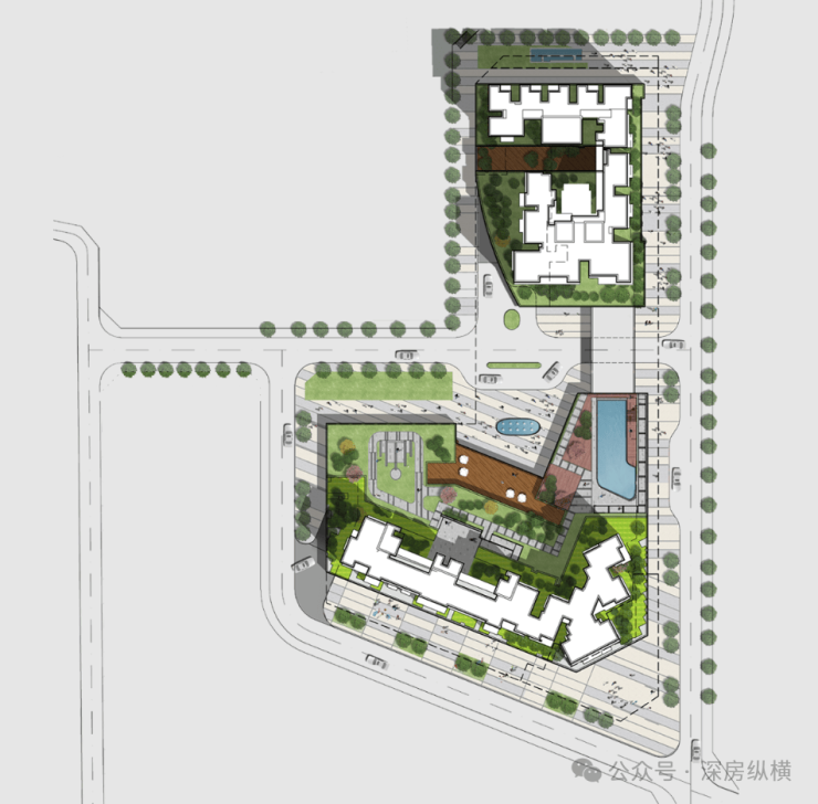 项目共有2栋楼,由南、北塔组成。其中南塔楼层较低,共有32层,包含回迁房、保障房以及商务办公;而北塔分为A、B两单元,其中A单元为住宅,共45层;B单元为公寓,共43层,1-5层为商业办公区域,6层为社区空中花园,7层往上才是住宅以及公寓。