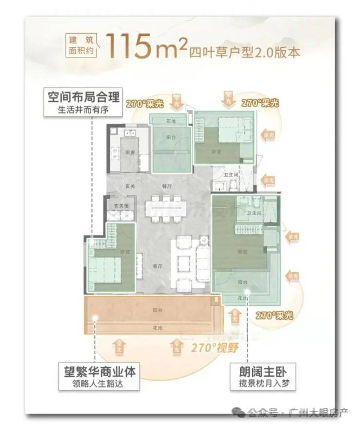 另一个则是户型本身独具魅力,没有选择传统格局,而是带来更新潮的“四叶草”户型2.0版本。