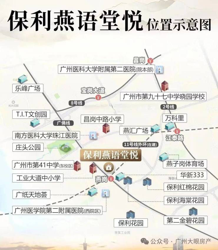 项目位于海珠区工业大道中的燕岗地铁站旁,地铁上盖项目(在建中的11号线+广佛线),坐落于工业大道中,背靠珠江后航道,傲立于海珠新活力文商旅融合圈与广州市"首个"后航道服务型制造创新带交汇的核心地带,海珠后航道将成为海珠未来唯一连片开发的豪宅板块。