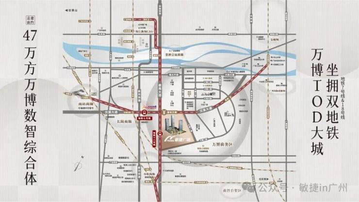 站在城市发展黄金双中轴交汇处,敏捷广场以 220 米天际线定义万博门户!纵向串联珠江新城 - 琶洲 - 万博 - 南沙的城市主脉,横向链接广州南站 - 汉溪长隆 - 国际创新城的经济横轴,双轴交汇的黄金十字坐标,让这里成为湾区资源聚合的超级枢纽。
