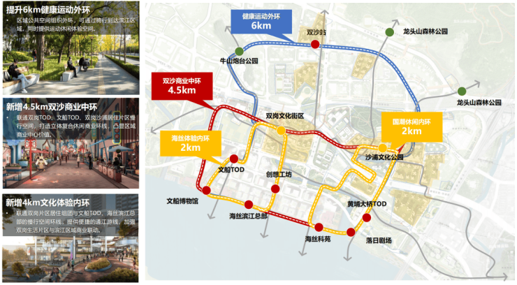 构建“两轴、一带、三廊、三环”的慢行系统网络,三环分别为6公里运动外环连接滨江,4.5公里商业中环连接华润万象系TOD商业,4公里文化体验内环连接各重要空间。