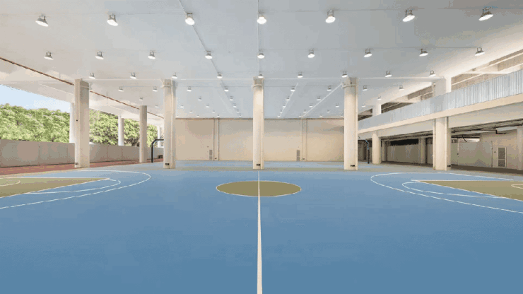 高大的教学楼、宽敞的体育场,且抬高的运动场底部,设置下沉式篮球场、兴趣大道、游泳馆、科技馆、艺术厅等场馆。