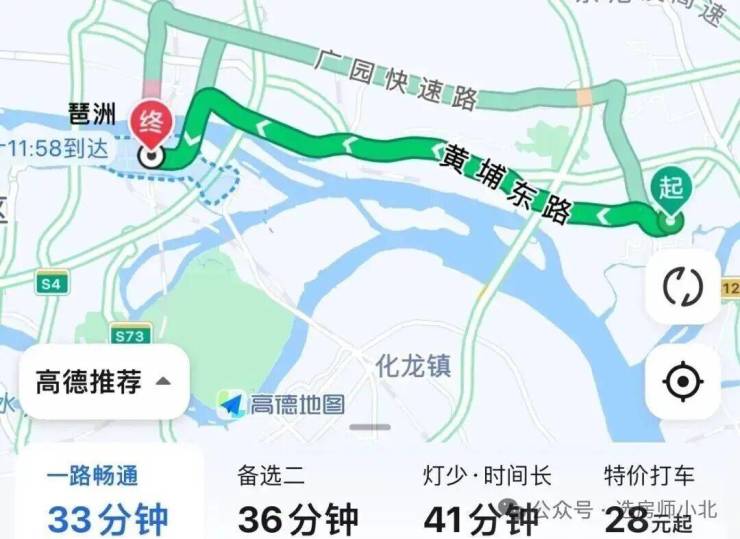 到琶洲:黄埔东路转黄埔大道再转车陂南隧道,全长19公里,不堵车情况下,耗时33分钟左右。