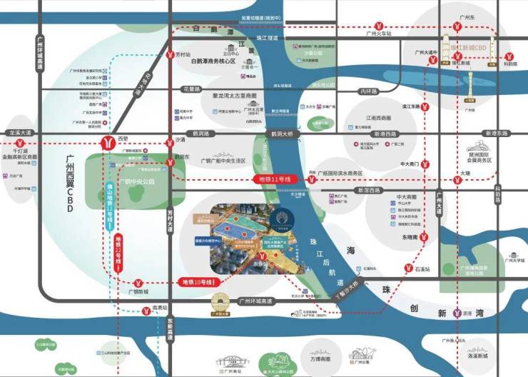 地铁:周边10、11、22号线(在建中)三地铁交汇,其中距离10号线东沙站仅约600米,串联天河区、白云区、越秀区、荔湾区和海珠区,连接广州火车站、广州东站等大型交通枢纽,便捷出行;