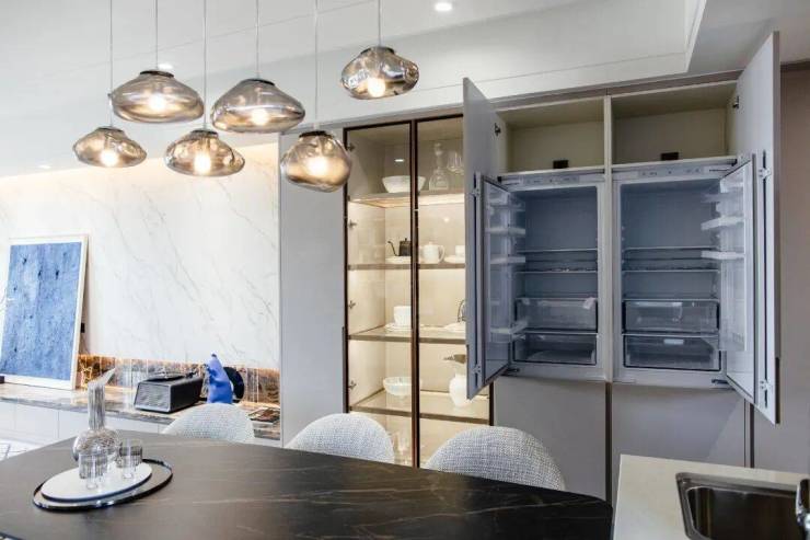 为了使厨房空间更具观赏性,设计师将烟机、冰箱、洗碗机隐藏,厨房整体线条更加流畅。