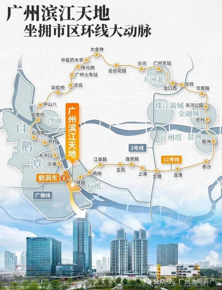 广州11号线鹤洞东站地铁上盖,拥有3横2纵大路网+公交站场+水上巴士,集水、陆、轨等多维交通方式于一体,半小时城央生活圈,1小时湾区生活圈。