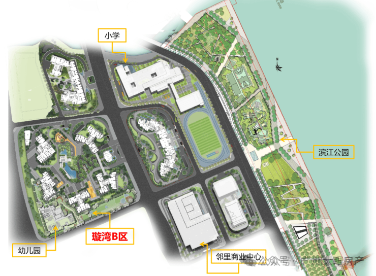 广州滨江天地·璇湾,为广州滨江上都第一期组团,总占地123653㎡,总建筑面积317811㎡,总计容面积约230000㎡(含小学),配建一所12班幼儿园+托儿所(位于璇湾B区)及一所小学(30班)