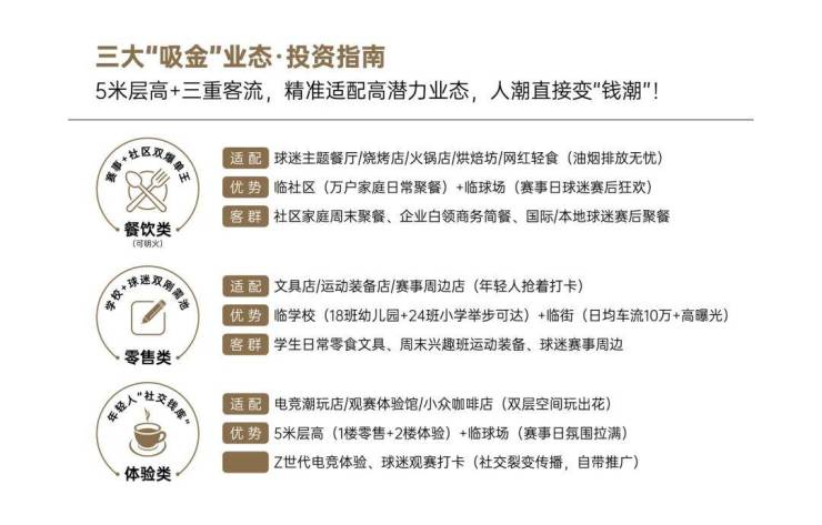 传统社区商铺租金100-200元/㎡·月,体育综合体临街铺“赛事+社区+产业”三重客流,租金享溢价,赛事日商铺客流暴增30倍!客流即钱流!