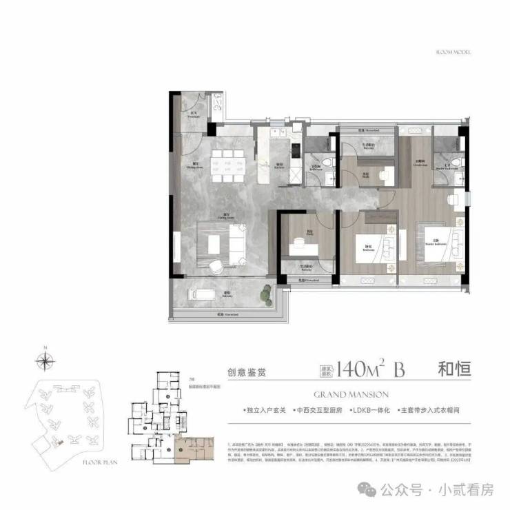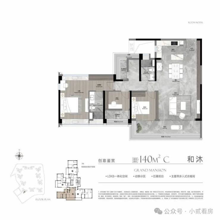 建面约180㎡产品迭代,将层高升级到了3.1米,LDKB一体化的尺度感更大更通明,餐客厅阳台视野和采光明朗舒服。