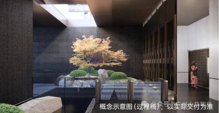 项目共规划约7.2万㎡超级中央园林,目前已开放实景园林。入户大堂以宝格丽酒店设计风格为灵感,搭配约7米高的艺术移门和奢石弧形墙面,高级感满满。