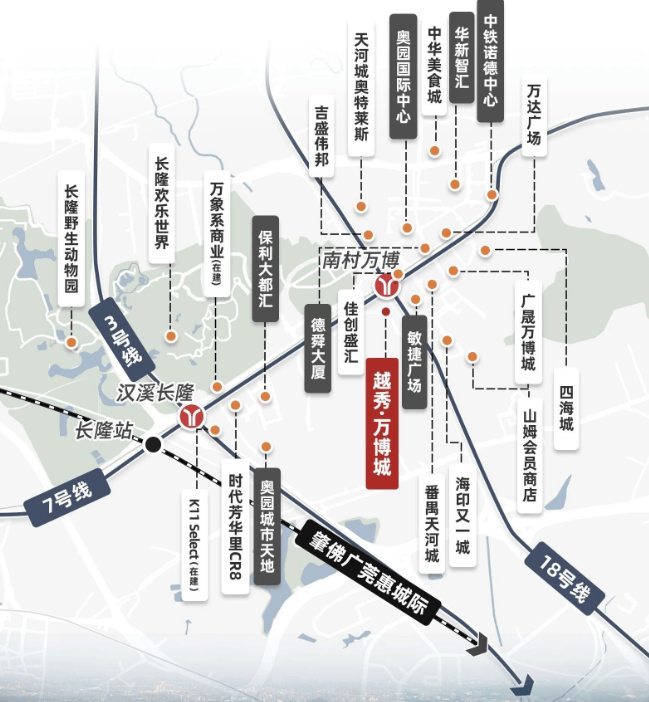 项目周边有地铁7和18号线交汇的南村万博站,不过目前在售的组团比较靠近锦绣香江,不靠主干道和地铁,步行至南村万博约1.3公里。不过未来社区会设置便民车接驳到地铁站。
