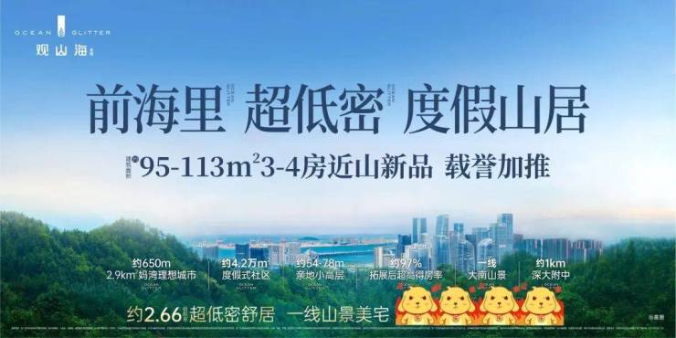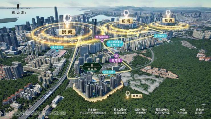在区位上,项目毗邻大南山,属于南山中心区荔湾板块,靠近前海妈湾片区和蛇口片区;附近有妈湾在售的万科瑧湾悦价格在10.5万,以及即将入市新盘有妈湾的前海招商臻玺预计在10万左右,项目这两个项目观山海花园并不在妈湾核心位置,属于比较边缘地界了,后面入市大概率价格方便也会稍微比较低一些,项目相比于这两个小区优势在于景观背山面海以及大社区花园。