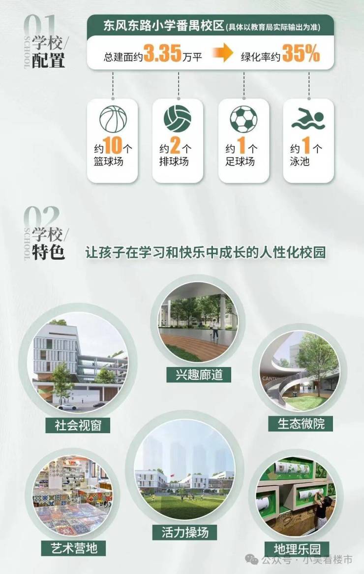 项目与东风东+广雅,不过一路之隔。孩子能实现目送式上学,幼儿园、小学到初中,都能从家楼下走几步路就到学校。