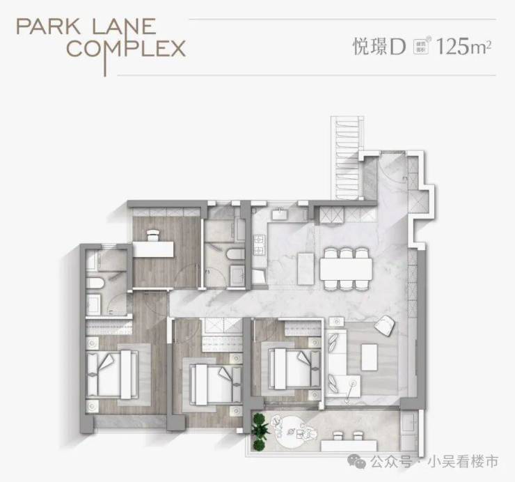 建面125平,三个南向卧室,约6.7米阳台,玄关大通柜+走廊置物柜人性化设计,轻松收纳所见物品,总价650-830万左右。
