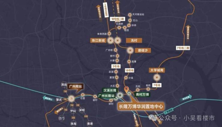 项目距离地铁3/7号线汉溪长隆站约500米左右,步行约8分钟,距离地铁7/18号线南村万博站约1.2公里,这三条地铁线,都是比较牛的线路,7号线可到南站、大学城、科学城,3号线可直达体育西,18号线更是国内最快时速地铁,直达琶洲、珠城等地,自驾的话,小区出门就是汉溪大道,可转新光和华快,去往市区都比较方便。