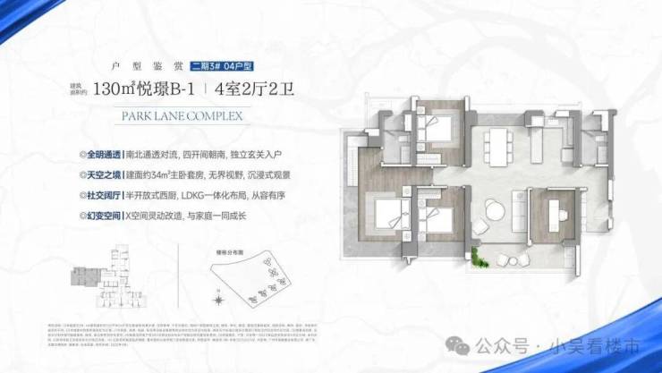 建面130平四房,可做横厅或者竖厅,还是南北对流,主卧带U型飘窗,两个次卧和客厅也有飘窗位,LDKG一体化设计,约34平奢阔主卧。
