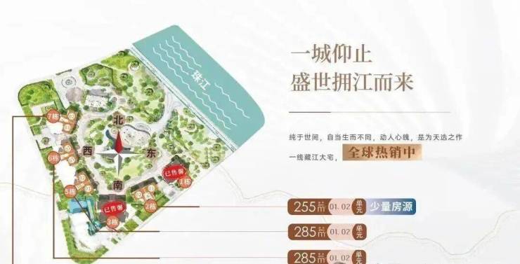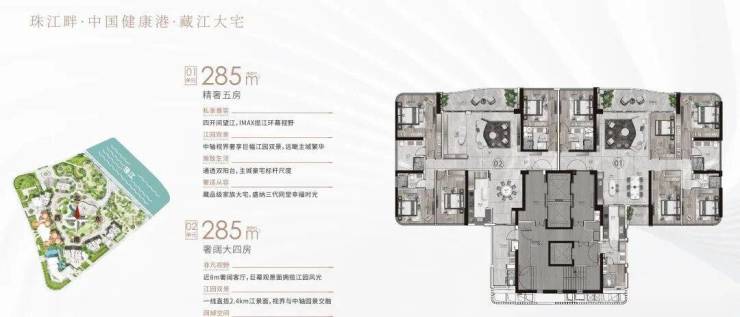 户型:建面约233-285㎡四至五房,东向/东南向一线望江,极致3.4-3.6m层高