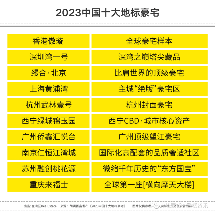 虽然近期广州冒出不少高价项目,但能被称为顶级豪宅的寥寥无几。为何敢这么说?下面两份豪宅表格可以参考!第一份来自胡润百富发布的《2023中国十大地标豪宅》,广州仅侨鑫汇悦台一个独苗上榜。
