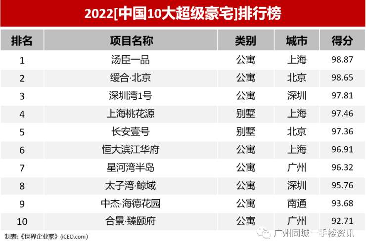这份榜单是以房产价格、项目地理位置、建筑空间设计为核心评选要素,并从开发商实力,社区环境,绿色环保低碳等指数作为评分标准。另一份则是世界企业家集团、世界地产研究院联合编制的2022年(第十八届)《中国10大超级豪宅》。而在这份排名中,广州共有星河湾半岛和合景·臻颐府两个项目上榜。