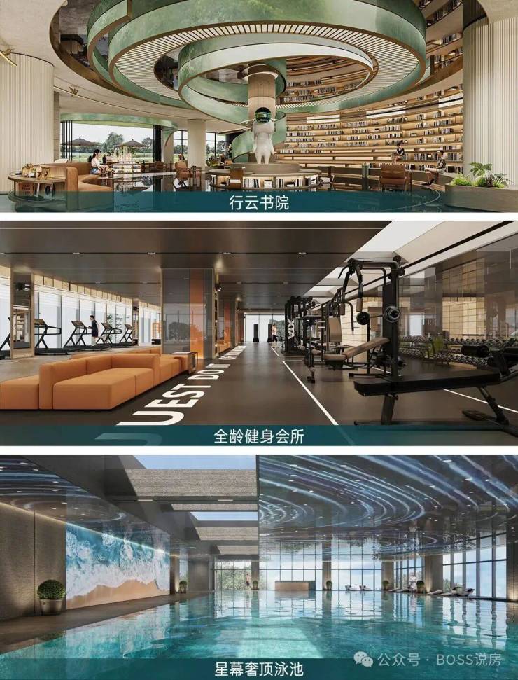 四重・中央会客厅:宽约 31 米双层立体叠合,高低叠水 + 阳光草坪,设休憩桌椅,适合业主会客、品茗;