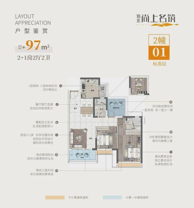片区少有高实用率N+1灵动户型,建筑面积约82-97㎡三房。以南向景观主流设计,同时考虑各功能分区合理运用,实现户型高增送弹性实用空间与南向景观最大化。