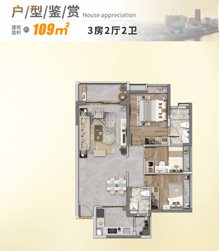 建面约109㎡江景大三房,三面单边,推窗即旖旎江畔,清风裹挟着水汽,似无形轻幔悄然入室。春节烟花夜,立于窗前,便能静赏「火树银花开,星桥铁锁开」的绚烂奇景。