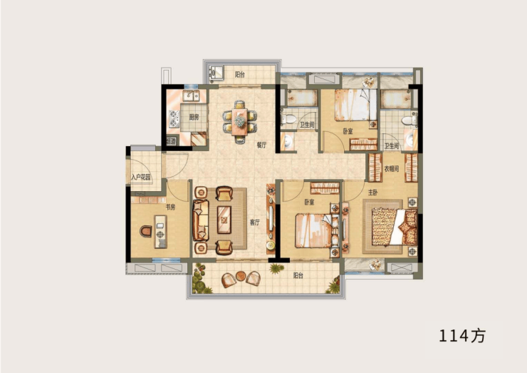 户型D,四房两厅两卫,建面约114㎡