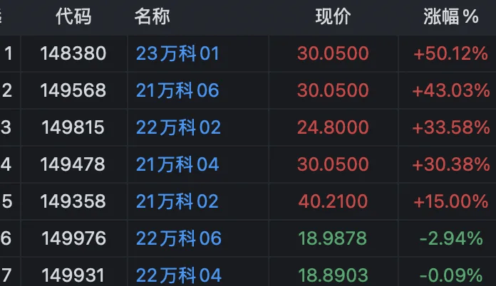 盘面上,万科多只境内债券飙涨一度触发交易所临时停牌,也引发不少关注。其中,“23万科01”涨超50%,“21万科06”涨逾40%、“22万科02”、“21万科04”涨超30%,“21万科02”涨约15%。